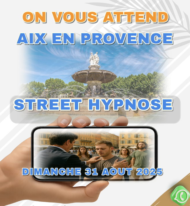 On vous attend pour une Journée Gratuite de Street Hypnose a Aix en Provence a partir de 11H La rotonde Samedi 20 Septembre 2025 Encore une journée dans la joie et la bonne humeur, l'hypnose rapide des découvertes. Free